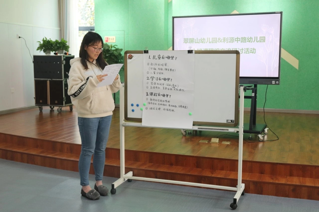 班本主题实施研讨环节分为小组讨论和大组交流,课程组老师结合自己对幼儿观察记录的内容及班本主题实施分享活动,进行灵魂三问儿童在哪里、学习在哪里、课程在哪里的回答,大家各抒己见、畅所欲言,分析交流现阶段班本化主题实施的适宜性及调整性策略,最后小组代表进行总结性发言。