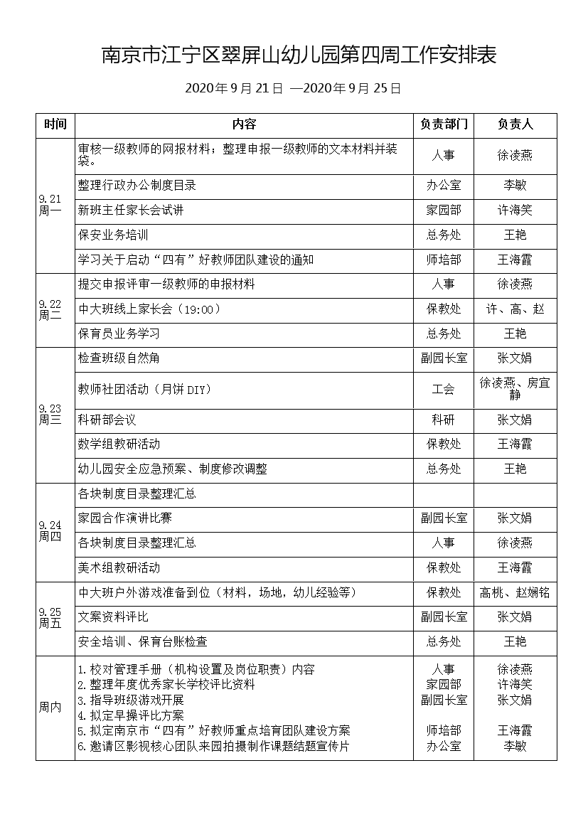 上一篇南京市江宁区翠屏山幼儿园第三周工作安排表(2020年9月14日—2020年9月18日 )