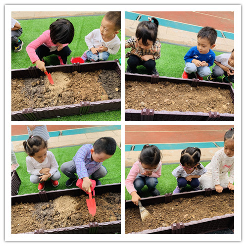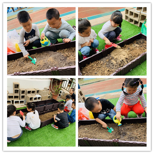 孩子们带着问题和老师一起讨论,“这个季节适合种什么植物?”、“什么植物变化最快?”、“什么植物会开花?”等等。讨论完之后,老师便和孩子一起动手。挖土、找容器、洒种子、种秧苗……大家忙得不亦乐乎。