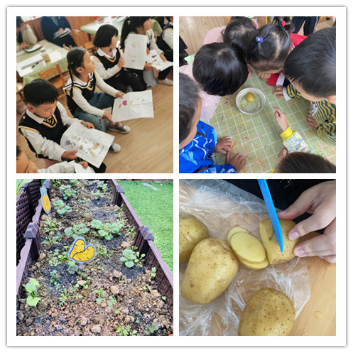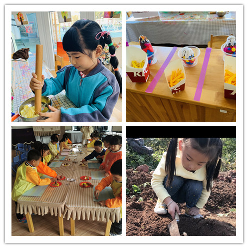 我们班“薯薯总动员”的班本课程来源于一次偶然的土豆发芽事件。孩子们对发芽的土豆产生了浓厚的兴趣,在秋天的主题下,班级里很多土豆开始冒芽,它们到底可以吃吗?它们该何去何从?逐渐的,我们结合了各方资源开始了支持儿童的探索系列活动,土豆种植,土豆沉浮实验,土豆可以做成什么美食?土豆探索结束后,兴趣不止,我们继续探索了其他薯类。渐渐的,孩子们的好奇和探索以个人儿童海报的形式进行了表征,班级的游戏也开始了变化,超市里多了很多薯类食物,小吃店里也开始了制作薯类食物,建构区的薯薯庄园也筹备了起来……通过这次班本课程的分享,我发现孩子们玩的很愉悦很享受,不过我也进行了自我反思:薯薯实验里的非牛顿流体小实验可以再降低点难度就更适合中班孩子了!另外后续的延伸可以继续结合孩子们的对根茎的兴趣仍然前行…