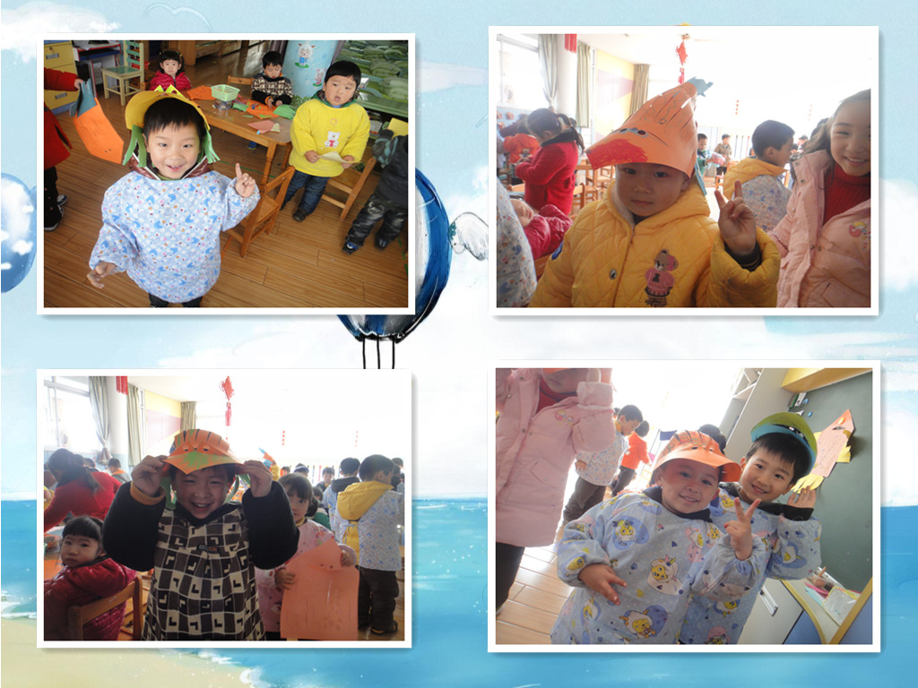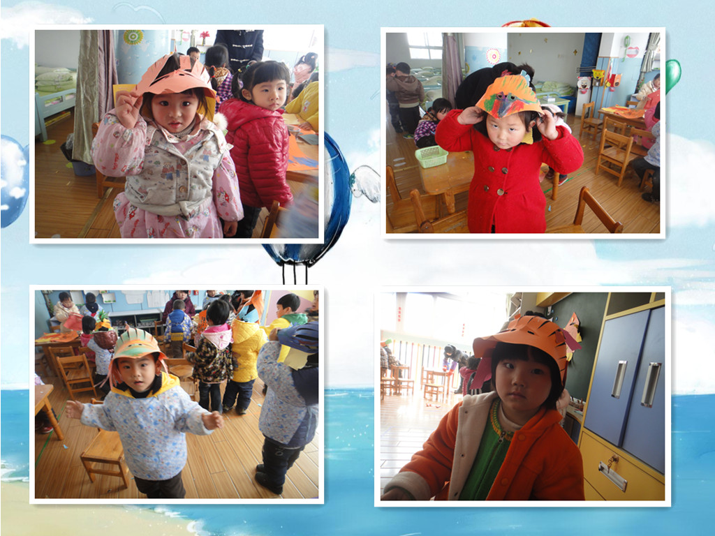 完成啦!快来看吧!戴上自己制作的小鸟头饰,老师给我照张相!