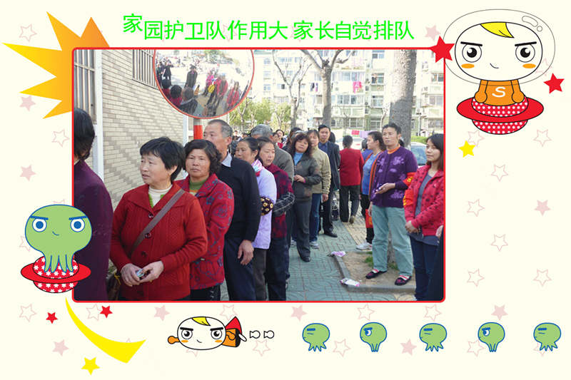 为了保障幼儿进园、离园的安全,解决离园时家长进园拥堵奔跑的问题,翠屏山幼儿园组织家长成立了一个“家园护卫队”。在家园通力协作下,家长们自觉进园、离园排队刷卡、有序进园,没有奔跑的现象。