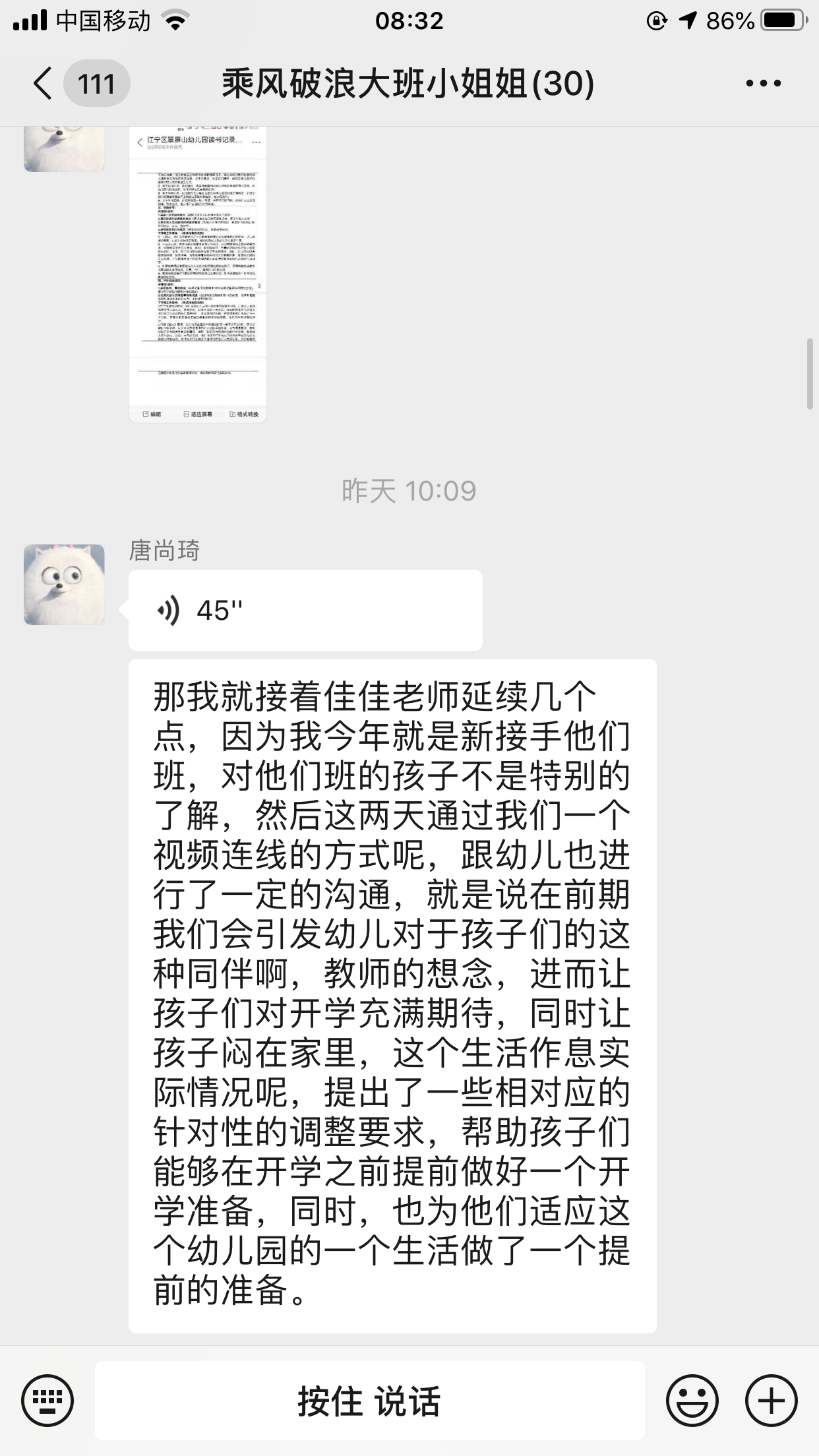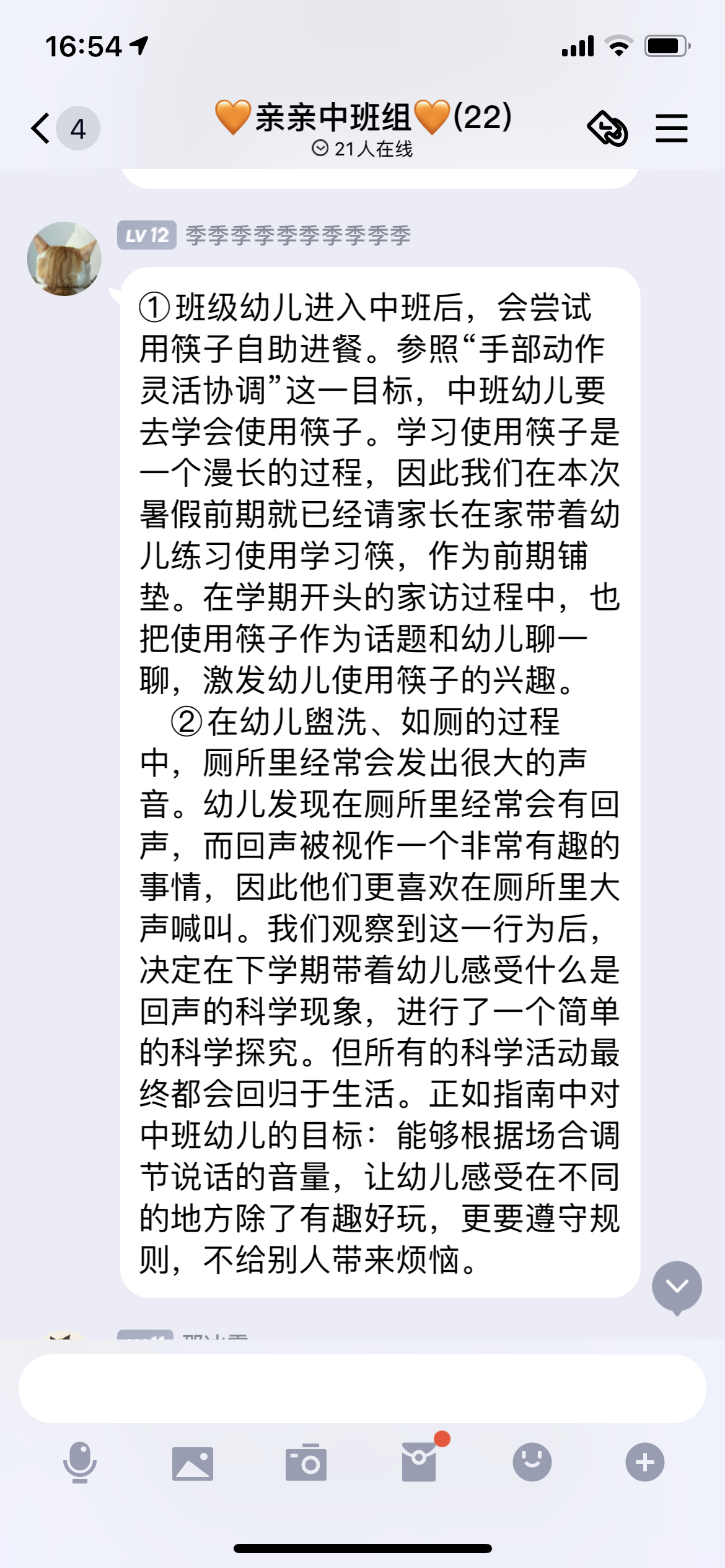 8月29日我们开展了主题为“《把《指南》的实施融入一日生活中》”的线上交流,老师们清楚的认识到幼儿的学习与发展是在一日生活中进行的,老师们从入离园环节、盥洗环节、转换环节、户外活动等一日中各个环节畅谈了本班运用《指南》精神贯穿实施的想法,有的老师在阅读活动后谈到,自己敏锐的发现门口新增的“一米排队线”,这是一个怎样引导幼儿规则意识的生活契机呢?幼儿为了学会生活、通过生活来学习生活,学习与生活相互交融,学习、生活、发展三位一体,就是幼儿学习最大的独特之处。