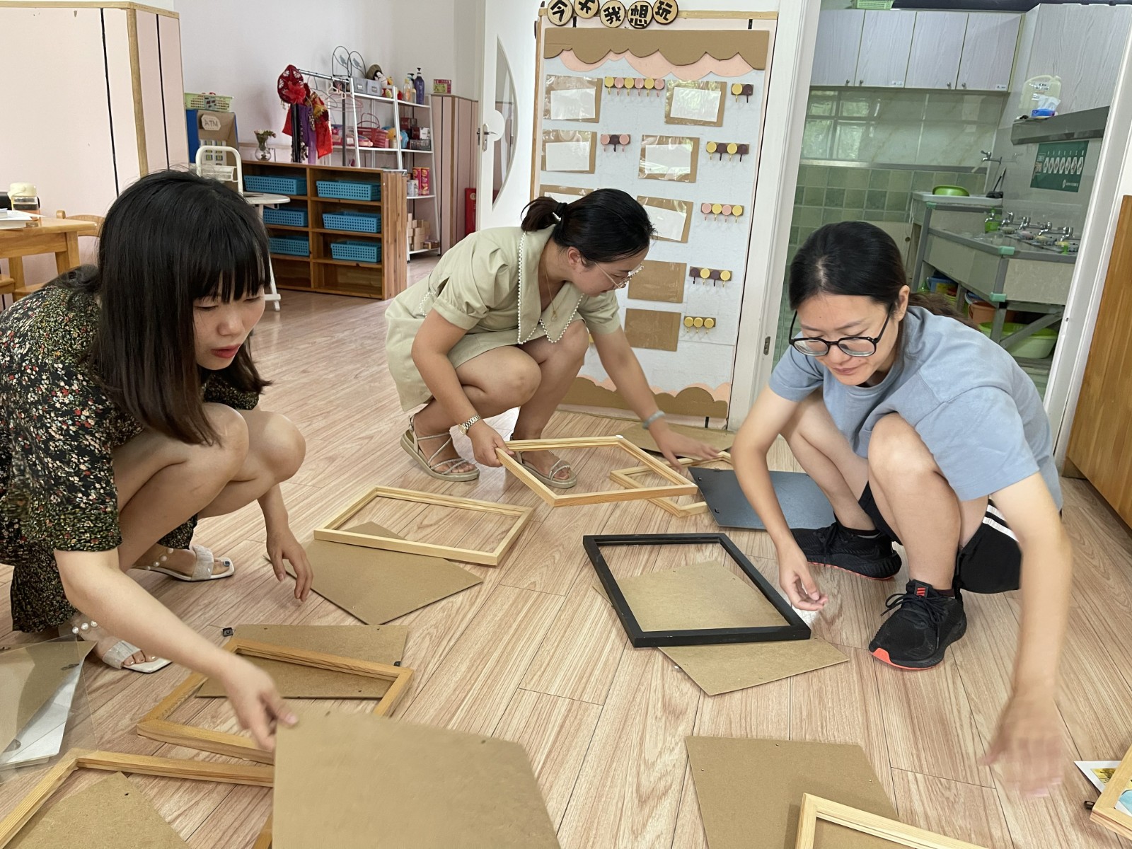 9月8日的开展了以“《0—8岁儿童环境创设——创设艺术区》的实操演练培训活动”。在《指南》的引领下,教师们深度剖析各年龄段幼儿在艺术方面的发展目标,认识到幼儿的真正需求,并阅读、学习《0-8岁儿童学习环境创设》书籍。教师们多视角、多维度地探讨交流美工区环境创设、材料投放、主题实施等方面的新奇想法,并制定了方案。