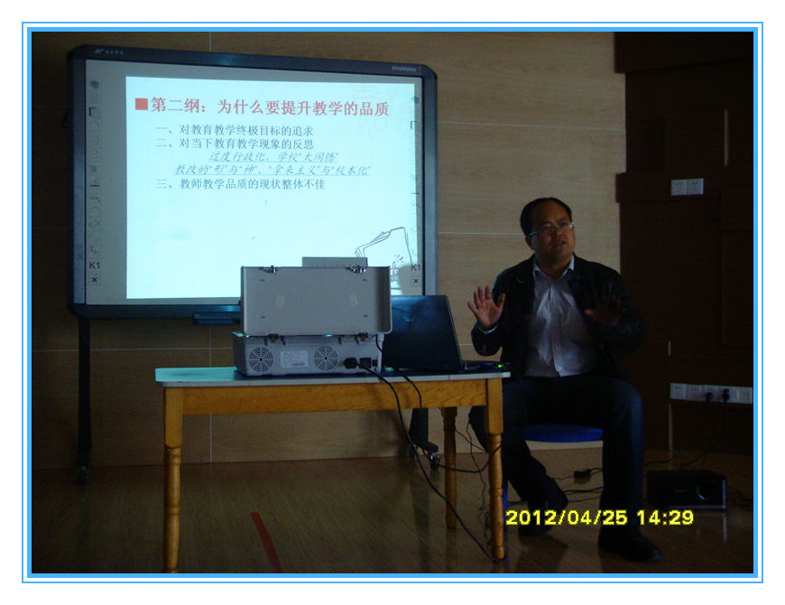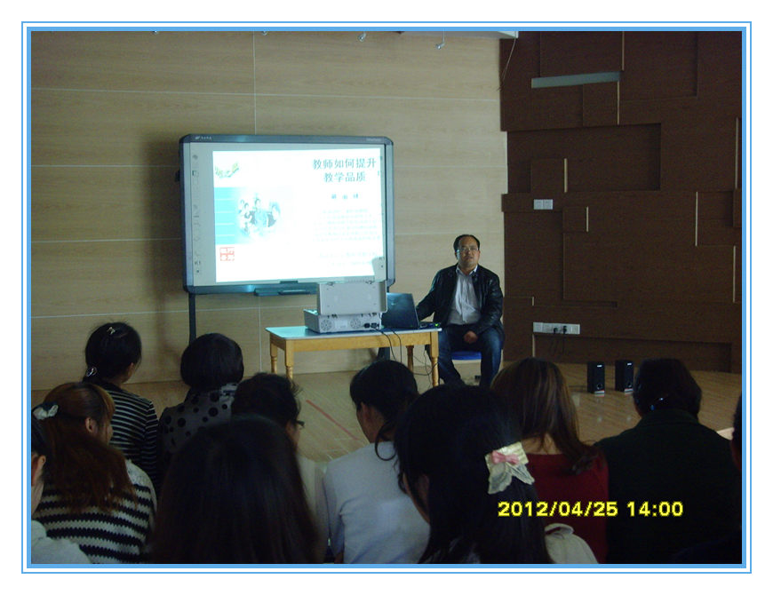 讲座中,解主任从什么是教学品质入手,论述了为什么要提高教学品质,如何提高教学品质,以及教师如何进行自我反思等一系列问题。他的讲座深入浅出、旁征博引,引用了许多个与我们生活工作息息相关的案例,幽默生动,赢得了现场阵阵掌声,让我们每一位聆听的教师重构了自己对于教学品质的理解,转变了思维方式。同时,也激活了教师个人的教学智慧,对于自己下阶段教学工作中的努力方向有了更为清晰的认识。