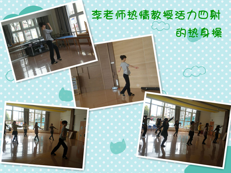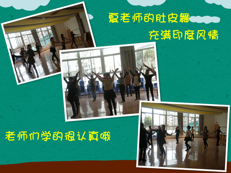 今天我们的活动丰富多彩,有活力的热身操,有热情的肚皮舞,快来走进我们多姿多彩的生活吧!