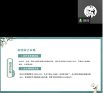 陈玲老师重点解读的是“以‘健行·智学·润德’为核心促进学生终身发展”这一部分。以书中提到的“学校德育远离了学生的生活,停留在简单而枯燥的说教”这一案例向大家强调教师要重视家访工作在学校家长工作中的重要性。之后,陈玲老师也向大家分享了自己结合教育实际梳理的家访工作的有效策略,如家访的密度要适宜、时间要适度、过程要有条理、要提前做一些准备,让家访的氛围更亲切以及家访后要对收集的信息进行分析等。相信有了陈玲老师的家访小妙招,大家对家访工作一定会有新的思考与提升!