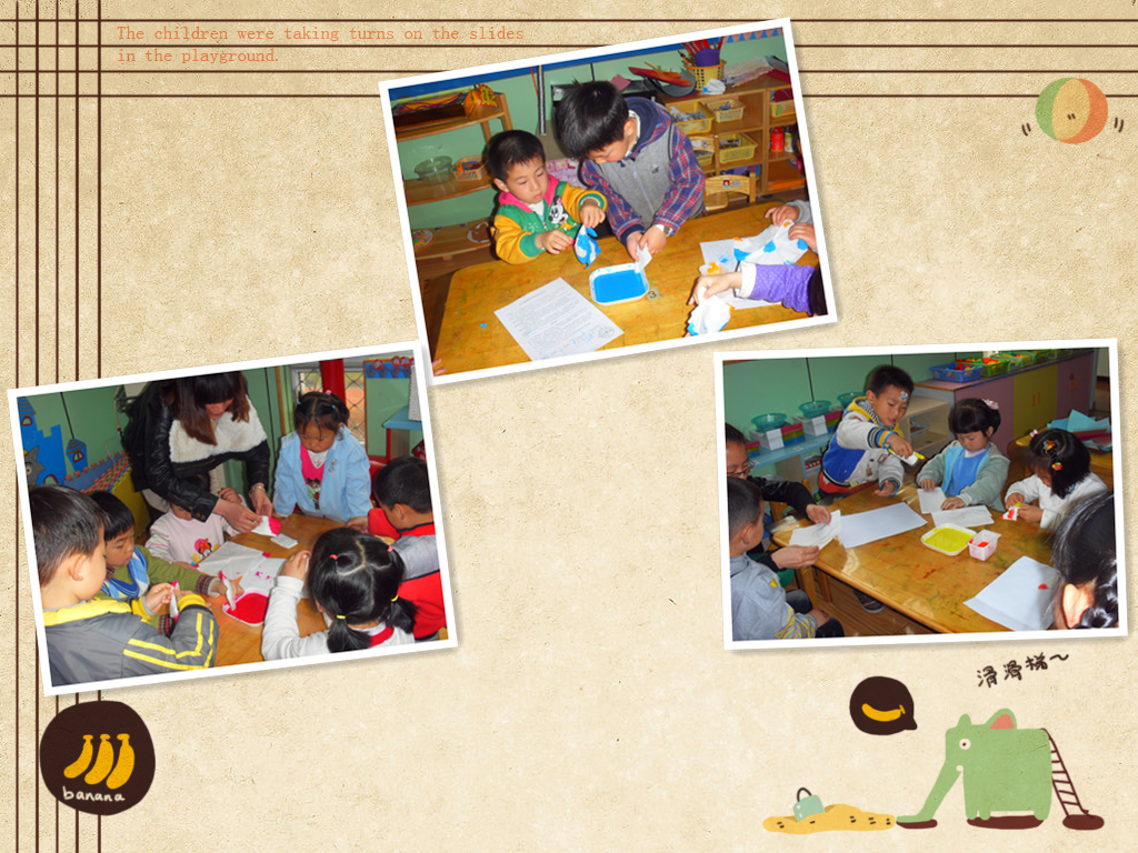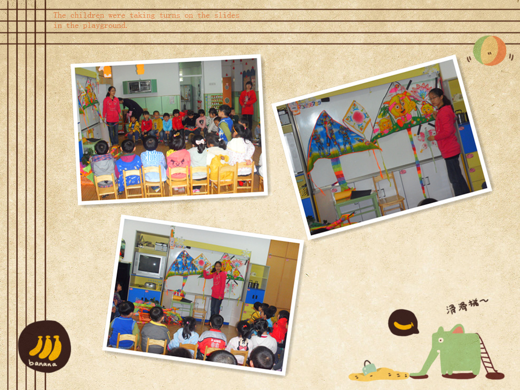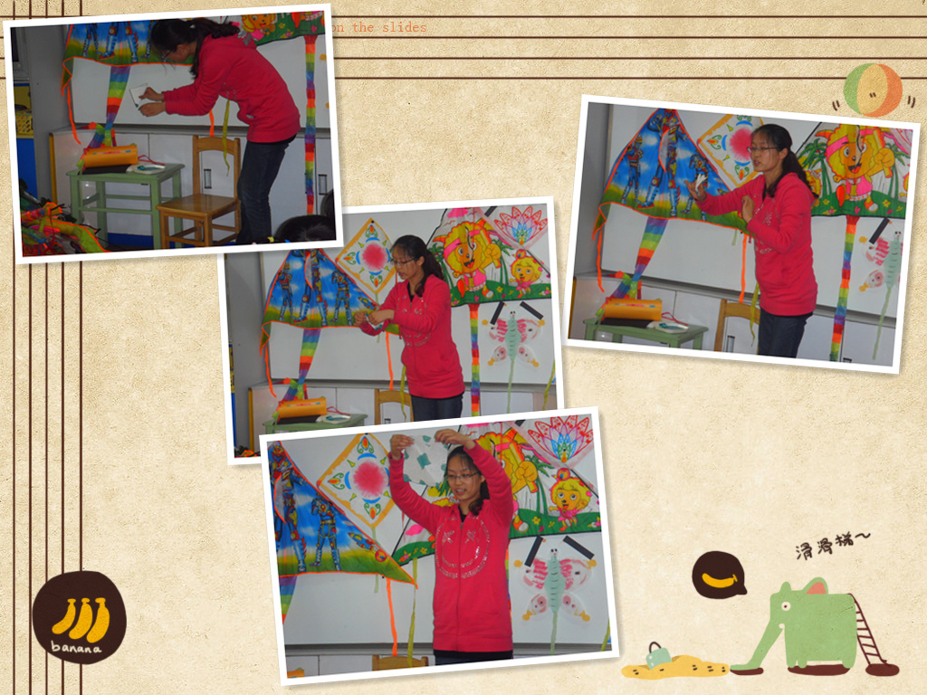 天上飞的风筝多美啊,爸爸也给我买了一个,不过老师今天要教我们自己做风筝,比比看谁做得好!
