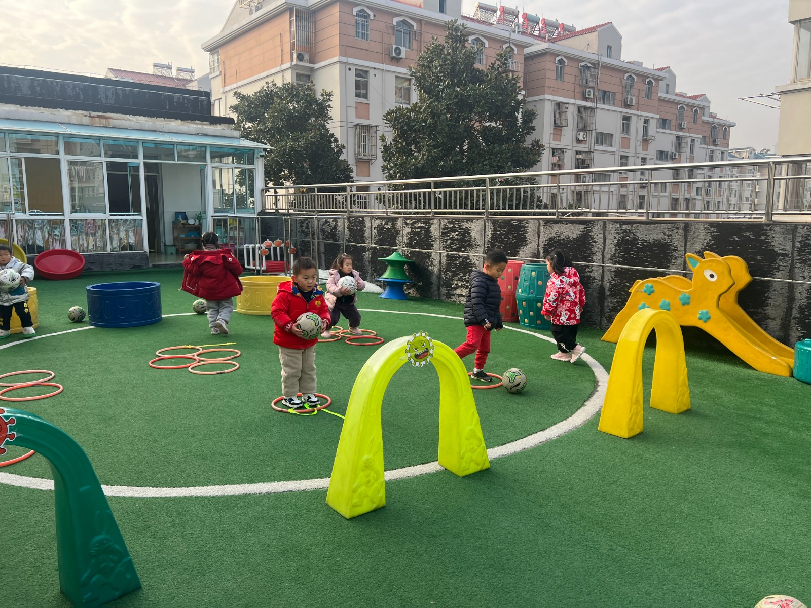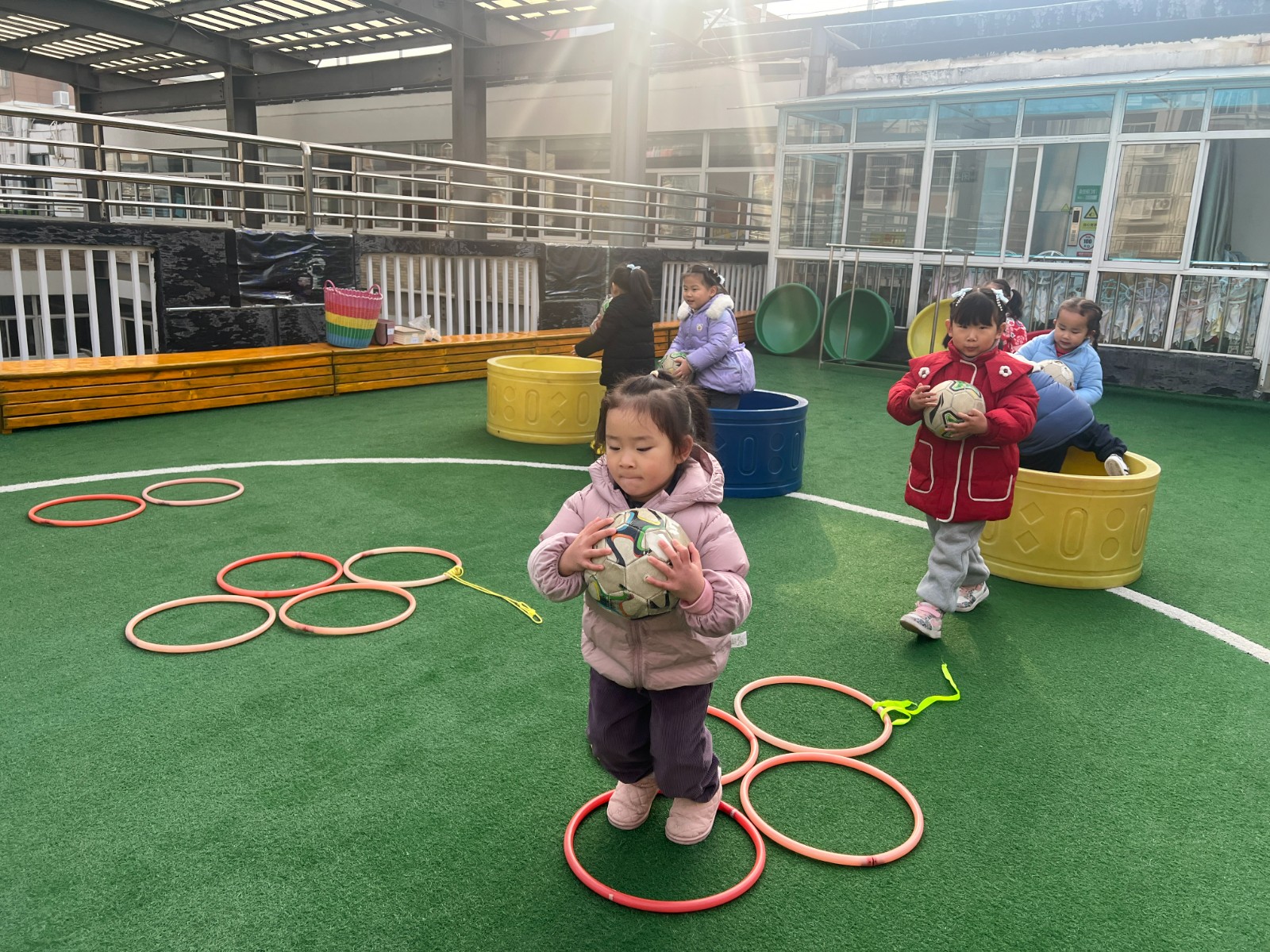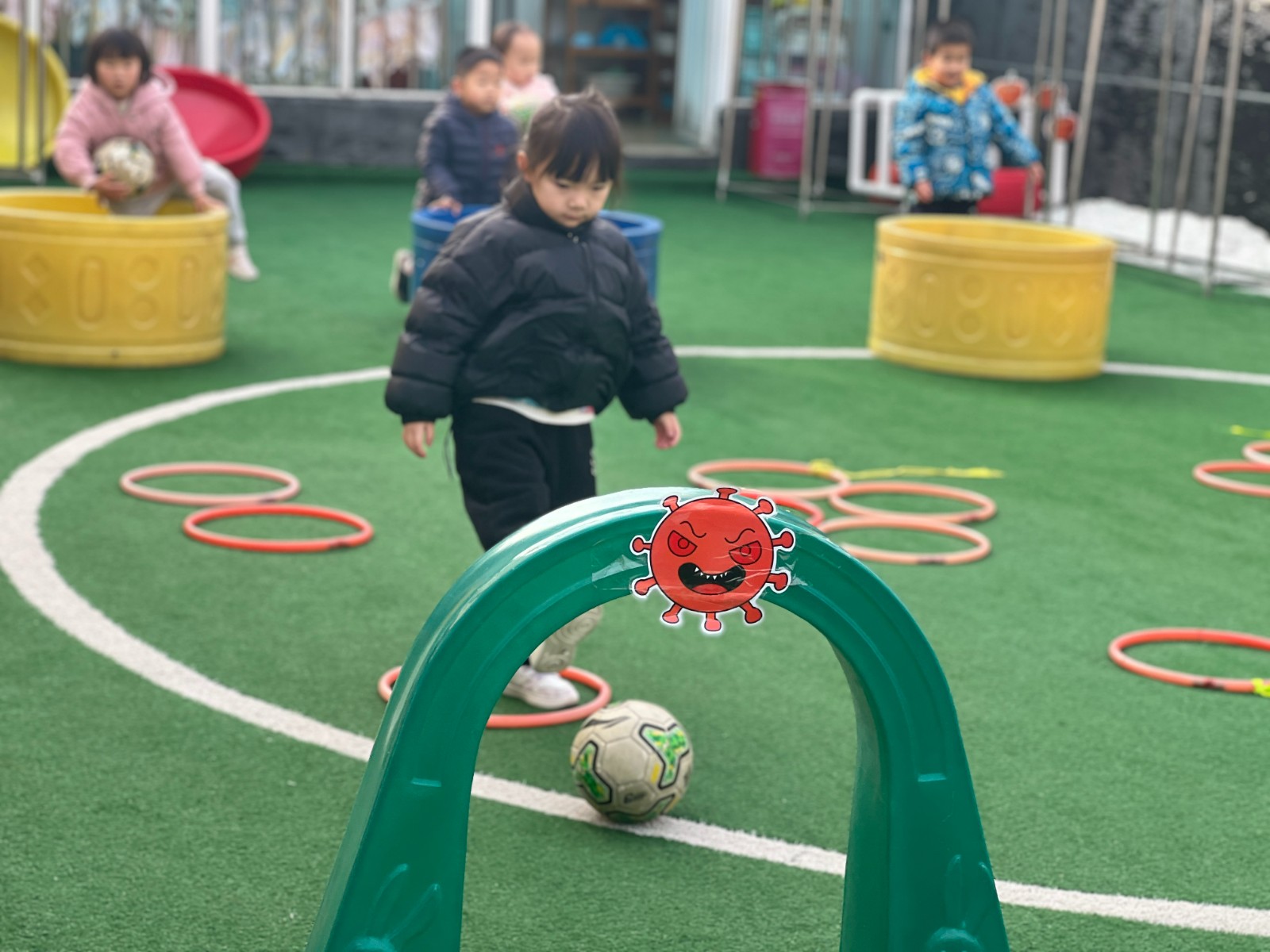 今天我们在户外进行了足球体育游戏:足球小将,小班的小朋友通过并脚跳过障碍物,然后在圆圈中将足球踢进球门里,孩子们可喜欢这个活动啦!足球小将可厉害啦,看一看他们活动的场景吧!