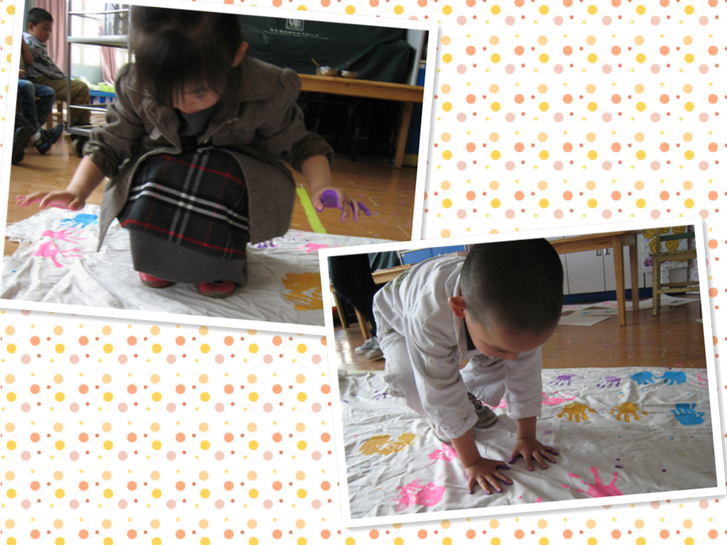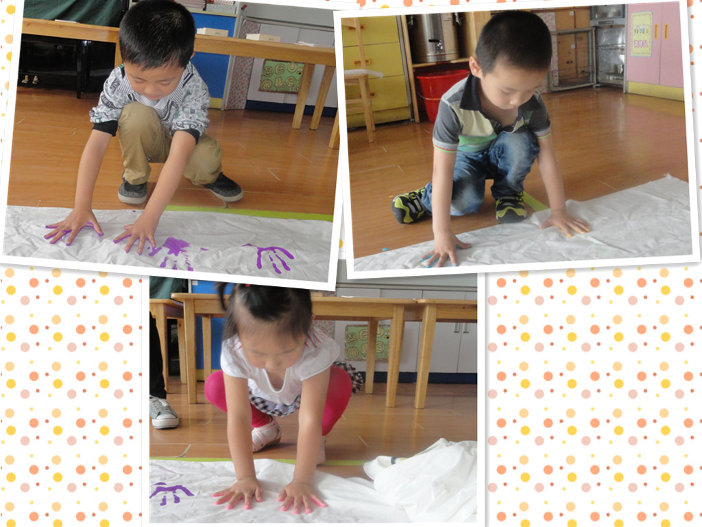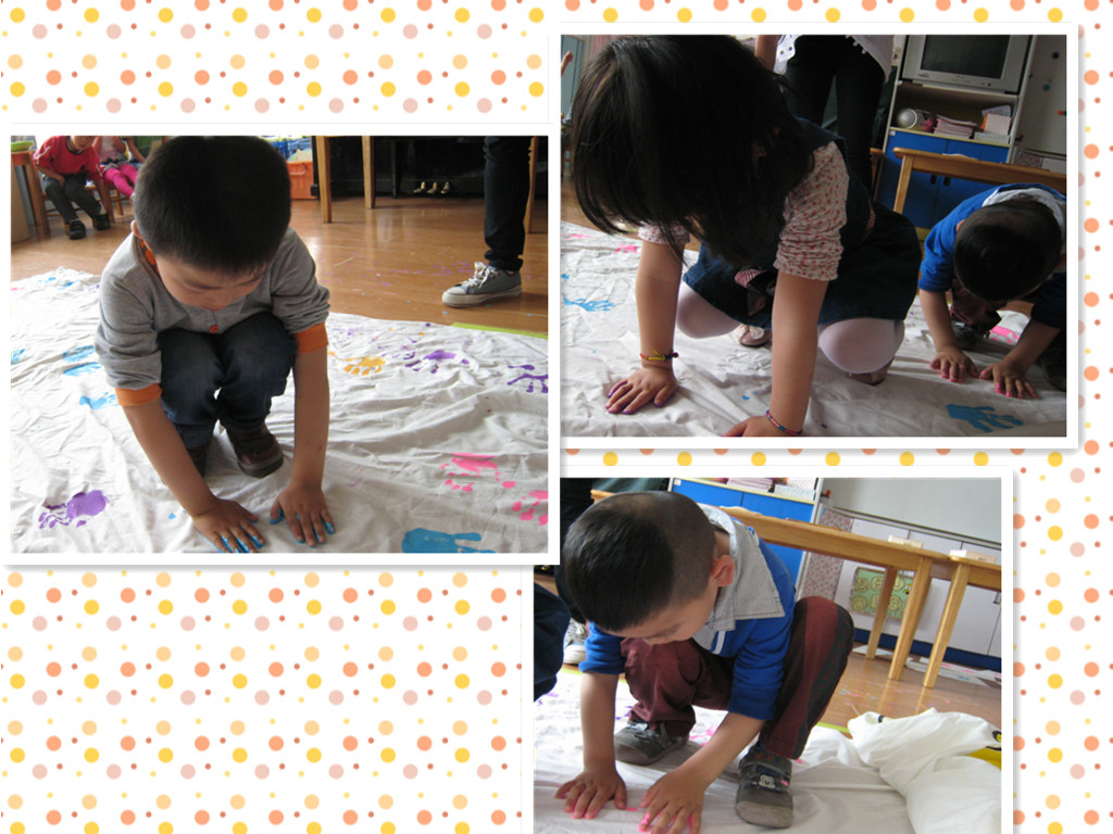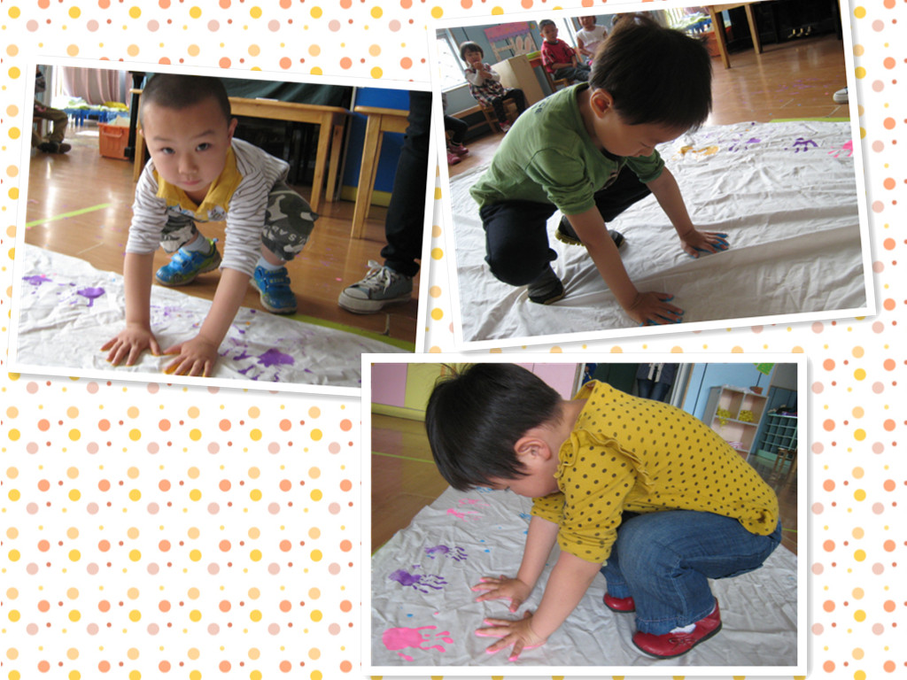 一双双可爱的小手,把它们印到布上,彩色的小掌印,好可爱的,爸爸妈妈快来看一看啊。