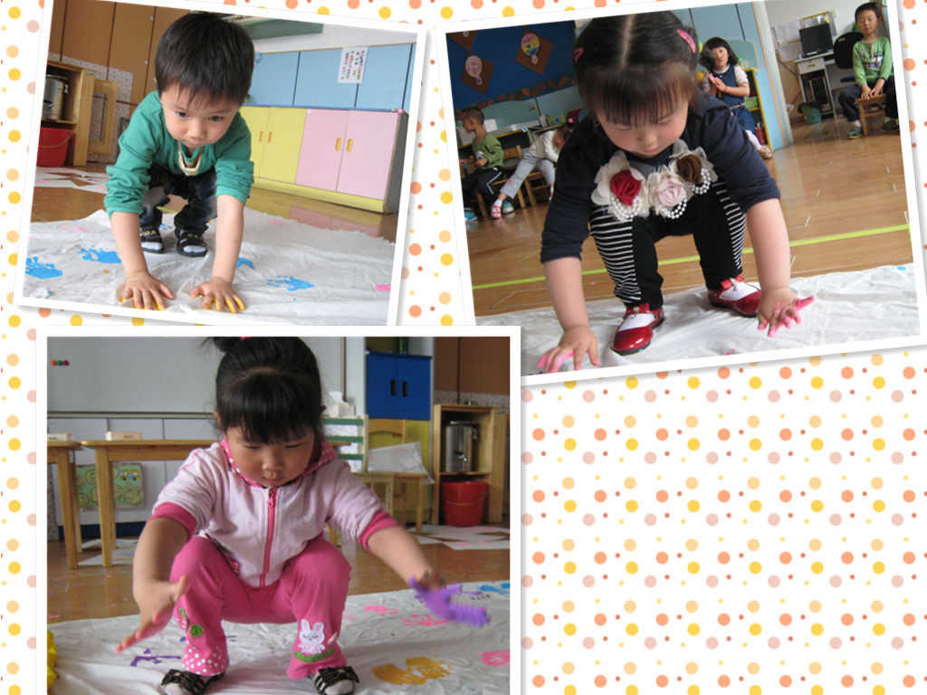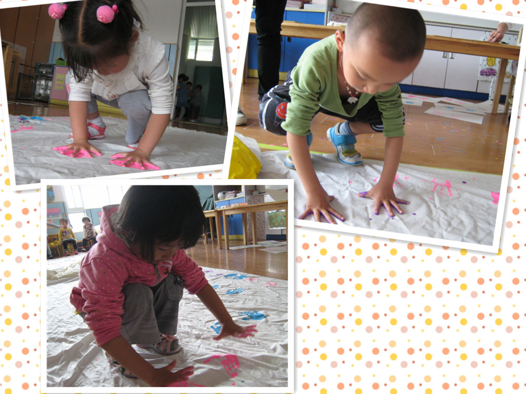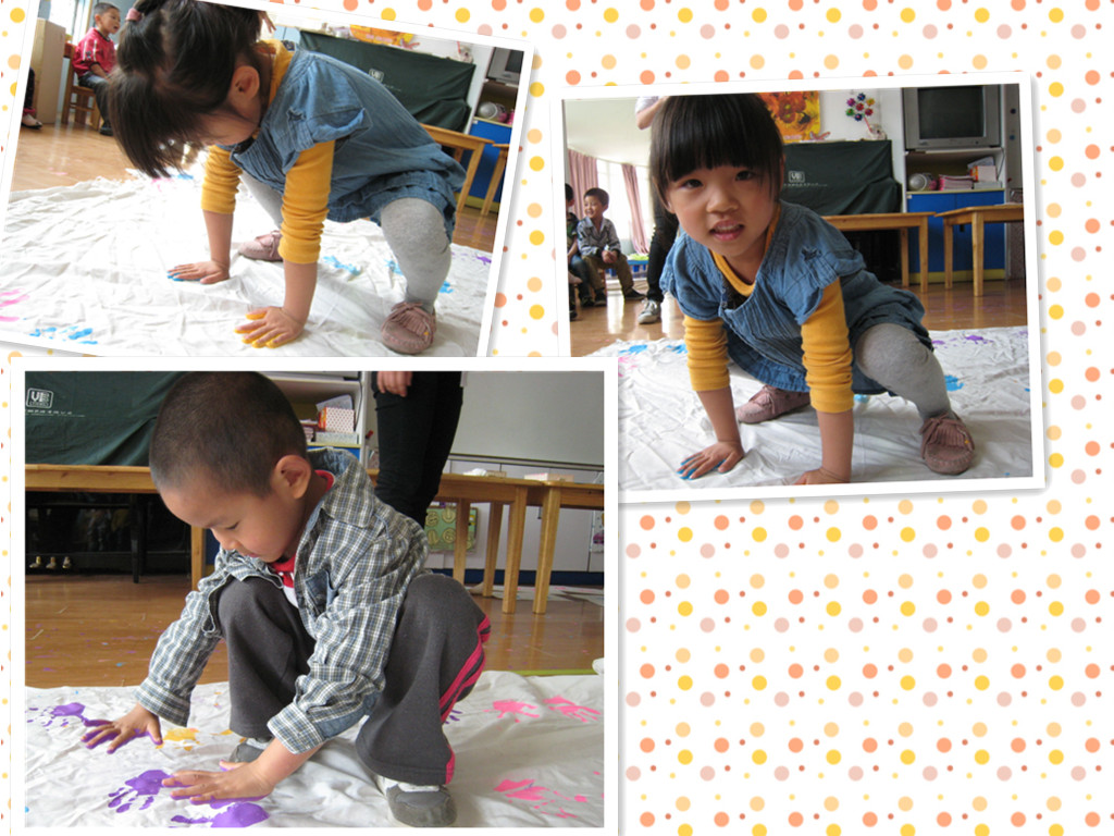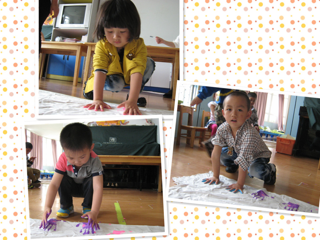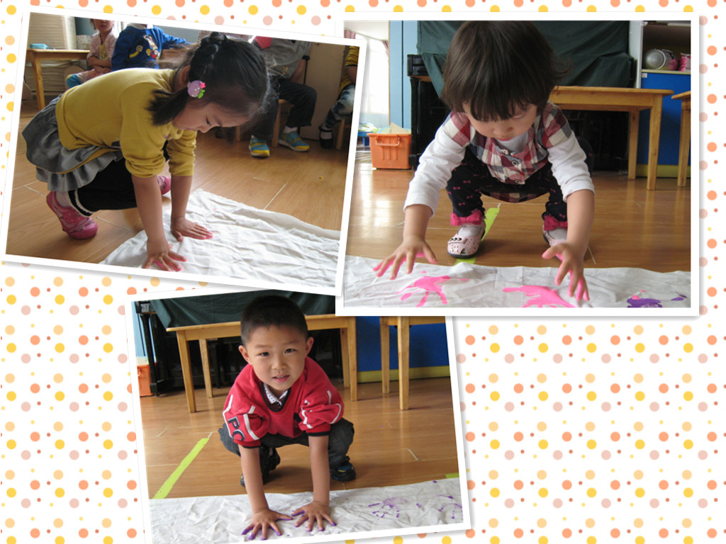 一双双可爱的小手,把它们印到布上,彩色的小掌印,好可爱的,爸爸妈妈快来看一看啊。