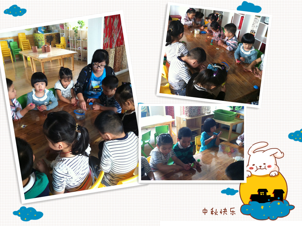 中秋节要到了,老师告诉我们中秋节要吃月饼,我们可开心啦!吃完了月饼,让我们一起动手来做月饼吧!看我做不像不像?中一班的宝宝祝全天下所有的小朋友中秋节快乐!