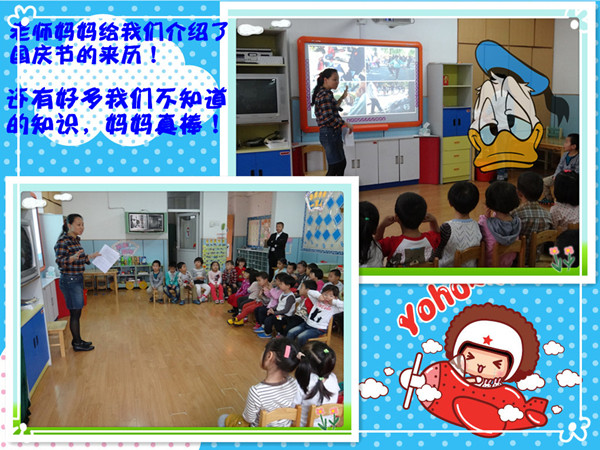 主题活动时妈妈老师给宝宝们介绍了很多关于我们的国庆节以及祖国妈妈的知识!