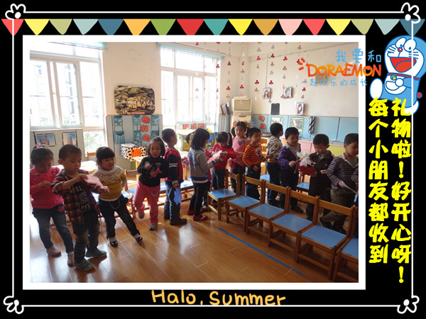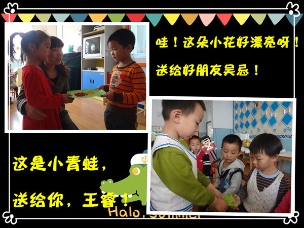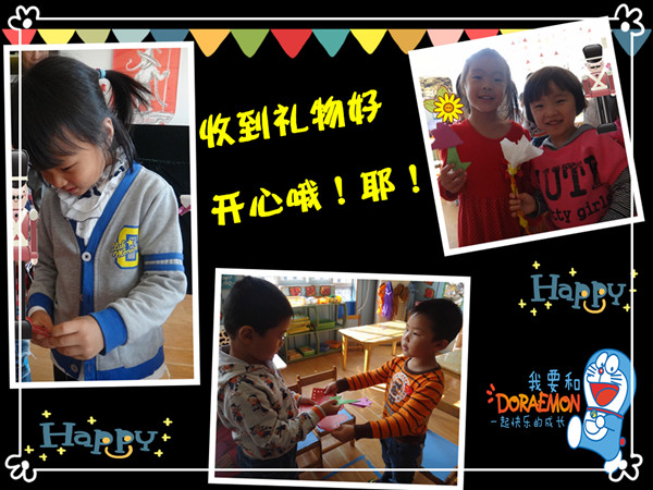 好多宝宝也很想得到礼物,在之后的主题活动《送给朋友的礼物》当中,我们利用机会请每位宝宝都都制作一份礼物并且互相交换,这样每位小朋友都得到了礼物并且感受到交换礼物、分享礼物的愉悦心情!