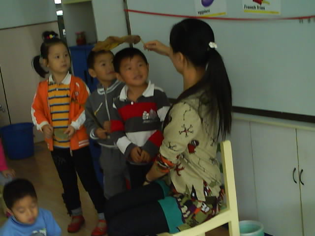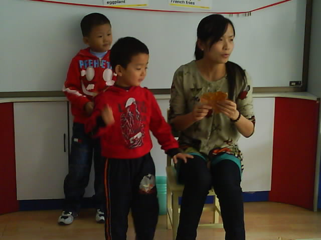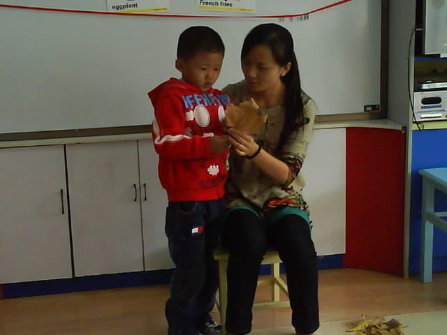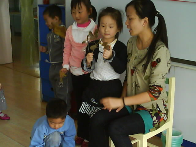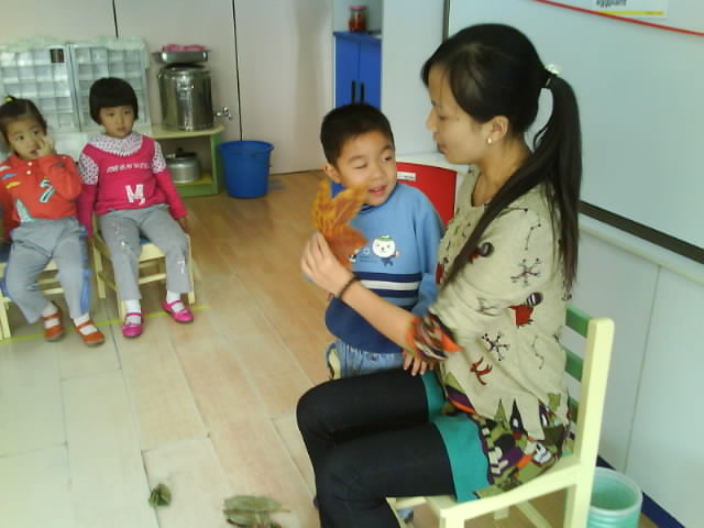 老师手上的落叶是我拾的哦! 我对老师说:树叶它老了,就黄了!