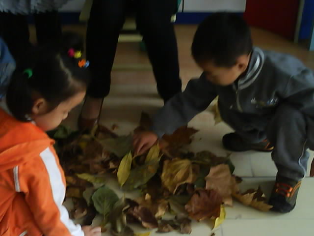 我在选一片自己最喜欢的落叶! 老师夸奖我拾的落叶很特别!