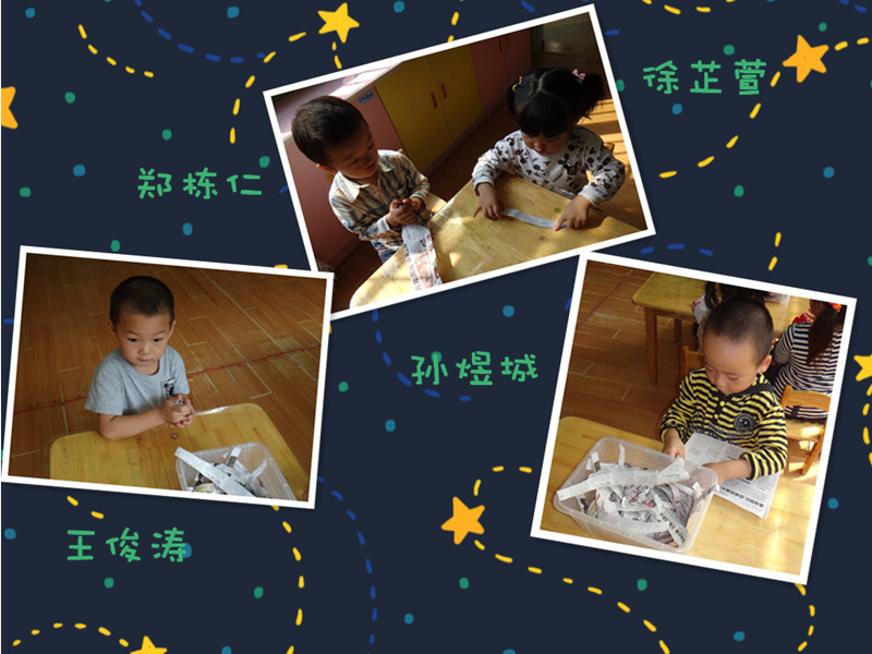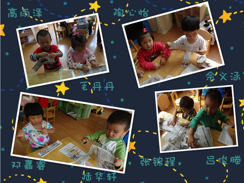 知道我们在做什么吗?让我告诉你,我们正在将许多的报纸条团成一个球,要团的紧紧的哦,这样你的报纸球才不会散掉,来看看我们精彩的活动吧!