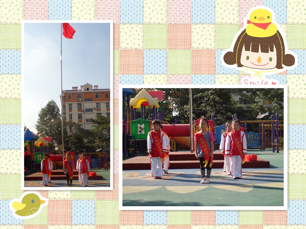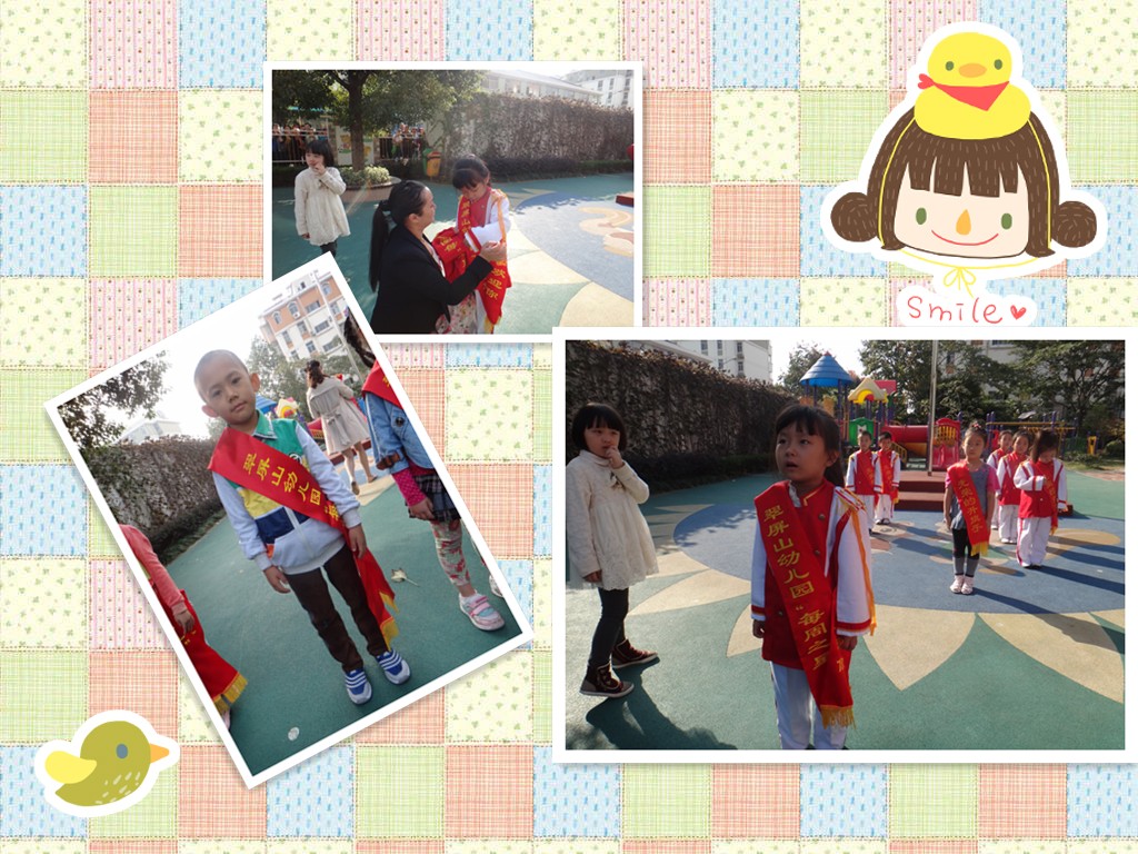 我被小朋友们选为“每周之星”,在国旗下园长老师为我们带上红红的荣誉绶带。(*^__^*) 嘻嘻……