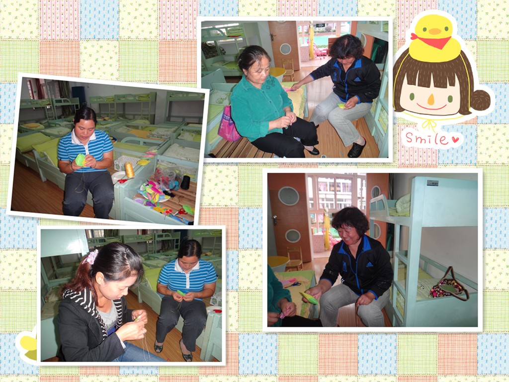 我班有一支技艺精湛的“妈妈手工坊”,她们是建豪妈妈、牟牟姥姥、彦哲奶奶、蕙琪妈妈。经常热心地为孩子们制作区域游戏的材料、协助制作班级环境。看着她们一针一线地为孩子们缝制美食区的布艺食物,心理觉得特别感动,有这样一支家长后援团,是我们工作的动力,同时也是我们工作的压力。我们只能更加尽心地教养孩子,唯有这样才能无愧于家长的信任和支持!