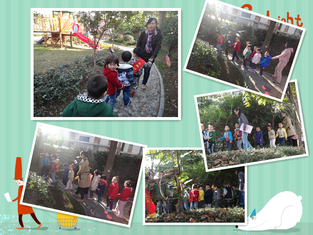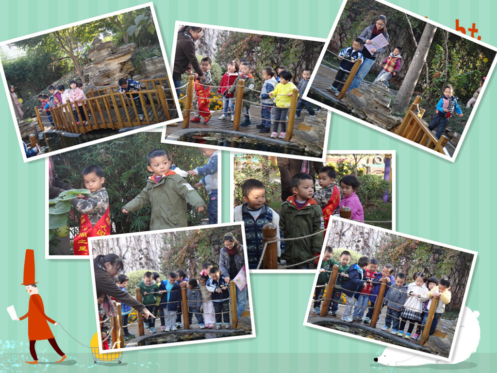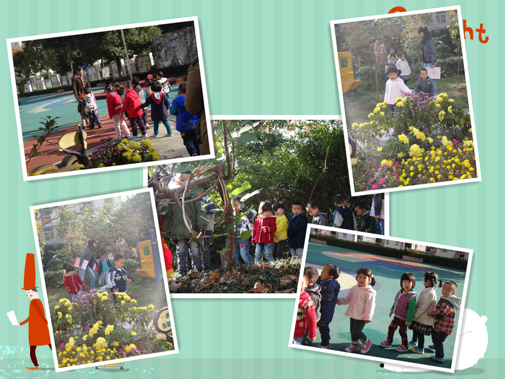 秋天到了,树叶宝宝都从树妈妈身上落下来了,我们小六班的宝宝们,多么想去看看大树妈妈。一早,我们排着长长的队伍,来到幼儿园的小树林,看望了各种各样的大树妈妈,感受秋天树叶的飘落,感受踩在落叶上发出的好听声音。我们穿过小山坡,钻过大象门,来到小池塘边,观看秋天小池里的小金鱼,大家开心极了,好好美丽的小金鱼在池里自由自在的游来游去!我们还欣赏了美丽的菊花,秋天的幼儿园真美丽!