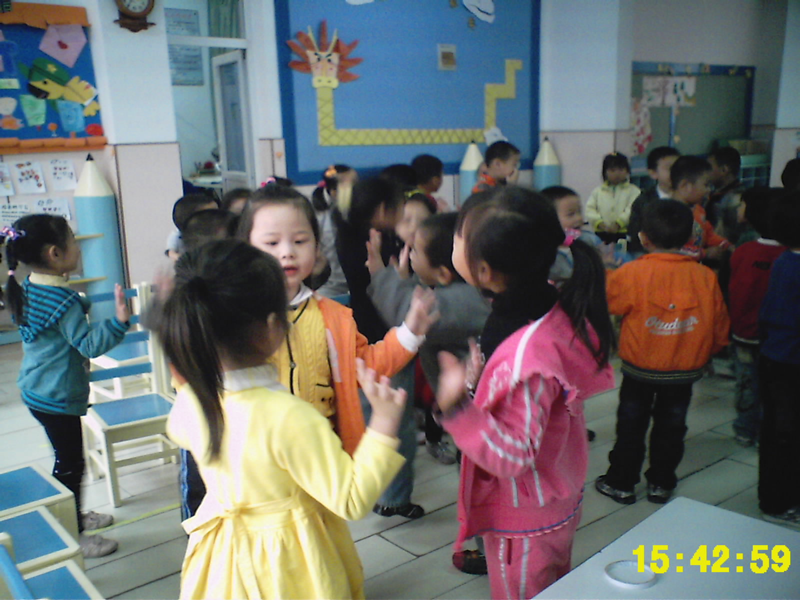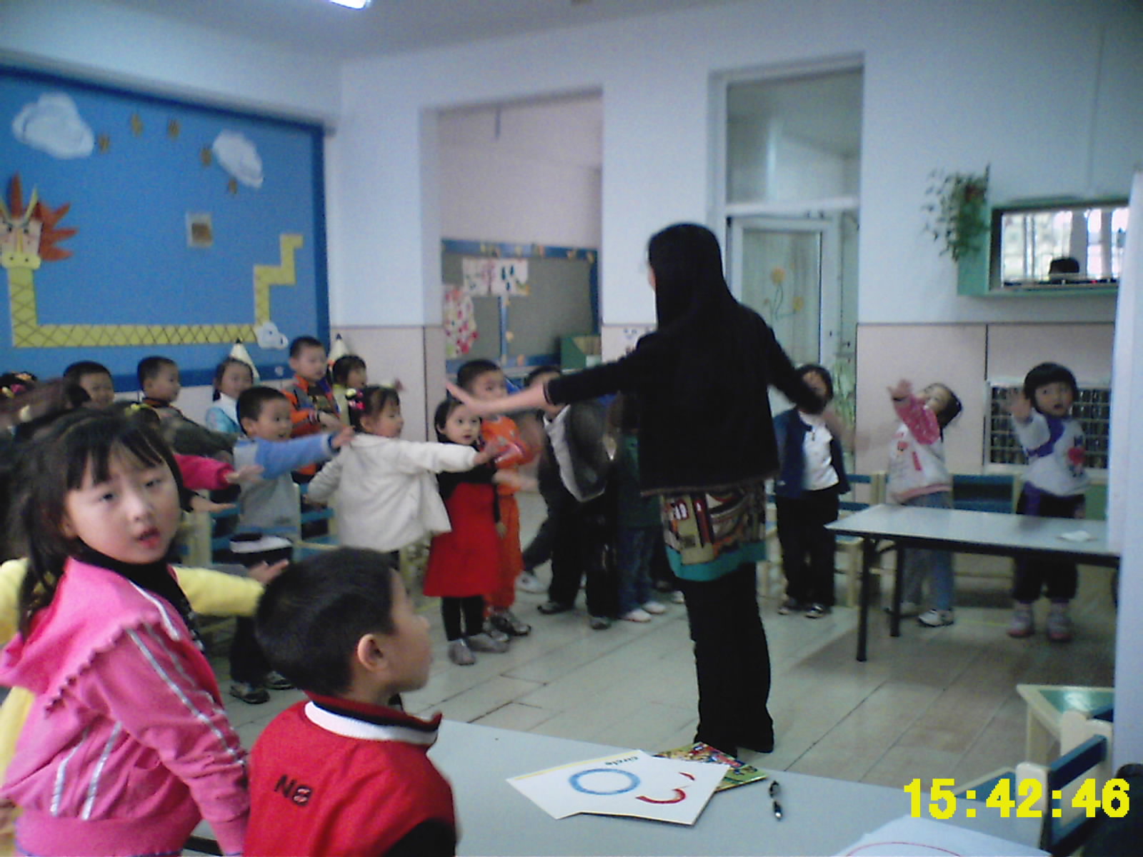 老师带我们一起唱英语歌呢。别烦我。 大家一起来玩英语游戏吧!