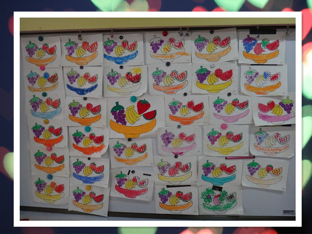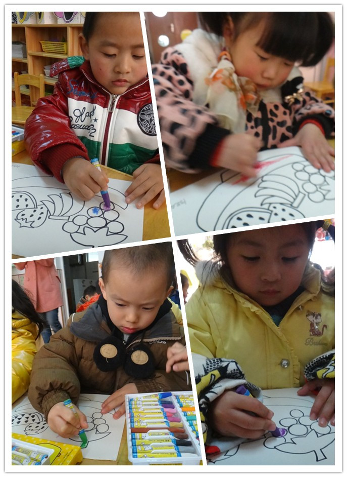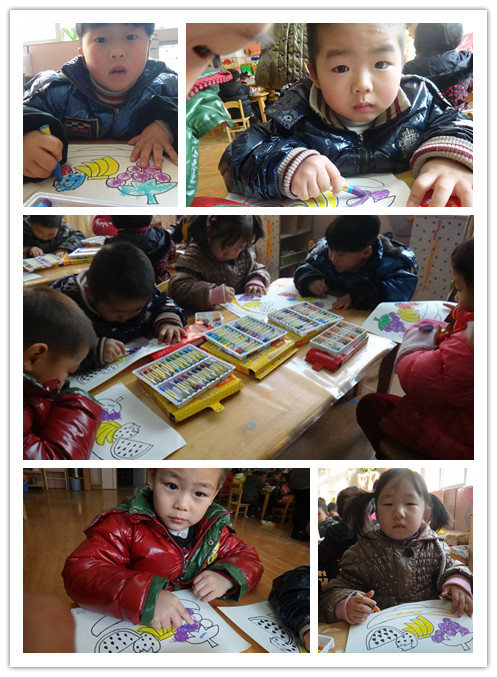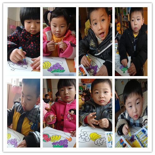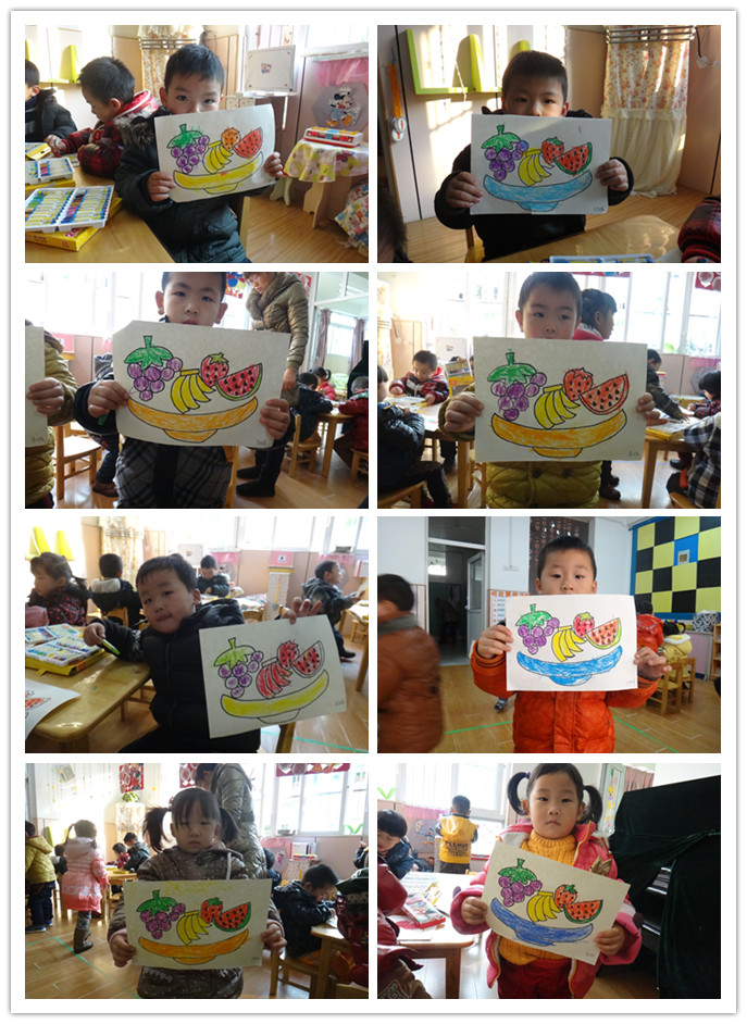 本次活动《好吃的果盘》是让孩子们认识常见水果的名称及特征,会用多种正确的颜色进行涂色,做到色彩均匀、画面饱满。通过本次涂色活动的练习还间接地让幼儿认识了紫色和桔黄色。活动中幼儿认真仔细,兴趣高昂。特色活动不仅提高了幼儿的涂色技能也使小手肌肉群得以锻炼,幼儿拿笔也越来越稳健。下面就请您欣赏下孩子们的作品吧!(*^__^*)