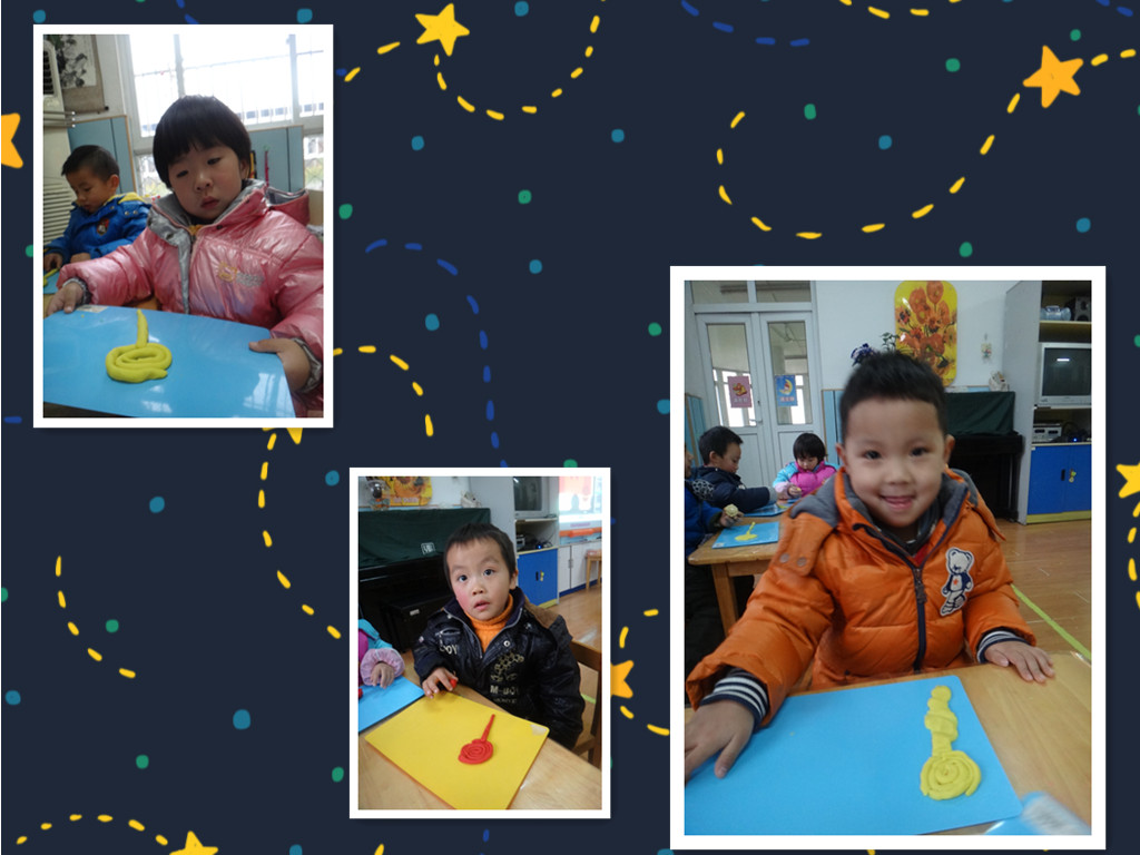 本周二我们开展了有趣的的特色油泥活动,漂亮的棒棒糖!结合了以前所学习的技法,让小朋友们充分动手发挥创造,小朋友们都很认真的在学哦!我们看一看他们漂亮的作品吧!