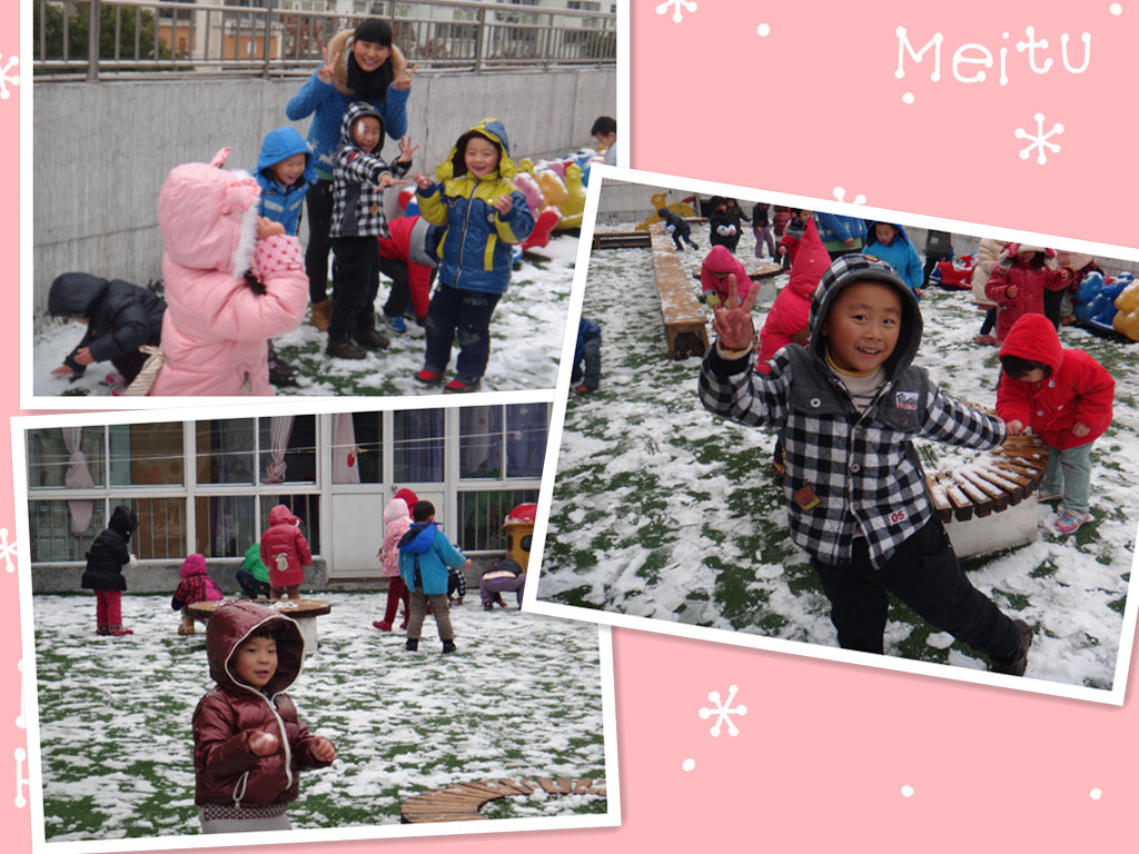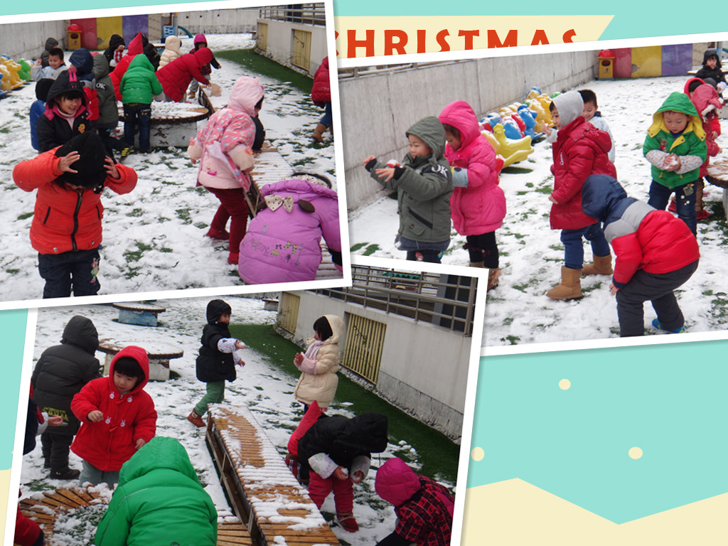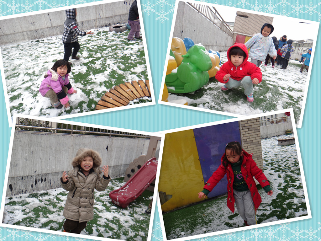 雪姐姐来啦!地上都是白白的一片,多美啊!老师带我们出去打雪仗喽!!真高兴!!!