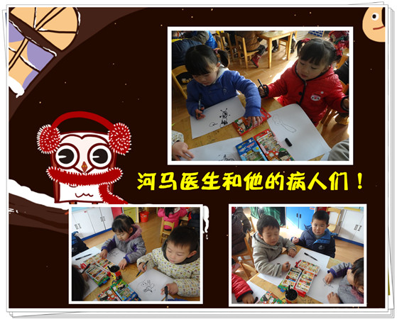 这组宝宝的想法和其他小朋友又不一样啦!一个宝宝画了一只河马医生,于是来了好多小动物找他看病,有看牙的,有看感冒的,还真热闹呢!看来河马医生的医术真的很高明哦!