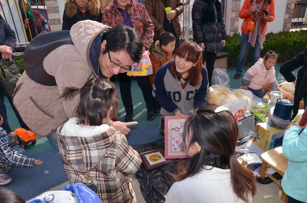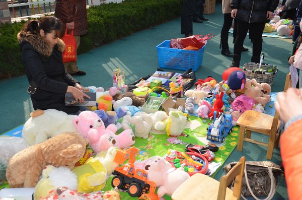 在二班的摊位前,摆设着琳琅满目的各种义卖品,有小朋友们心爱的玩具,有家长们